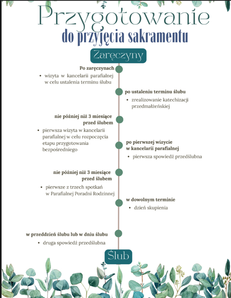 Przygotowując się do zawarcia małżeństwa, narzeczeni zobowiązani są do dwukrotnego przystąpienia do sakramentu pokuty i pojednania: na początku procesu przygotowania bezpośredniego do małżeństwa (czyli właśnie zaraz po wizycie w kancelarii parafialnej) oraz tuż przed zawarciem sakramentu małżeństwa.