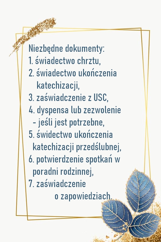Zawarcie małżeństwa sakramentalnego ze względu na swoją formę publiczną oraz skutki społeczne wymaga odpowiedniego przygotowania. W celu stwierdzenia pewnych faktów istotnych dla ważności Waszego małżeństwa w czasie pierwszego spotkania w kancelarii parafialnej zostaniecie poinformowani o tym, jakie dokumenty powinniście przedstawić przed zawarciem przez Was małżeństwa sakramentalnego.